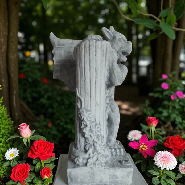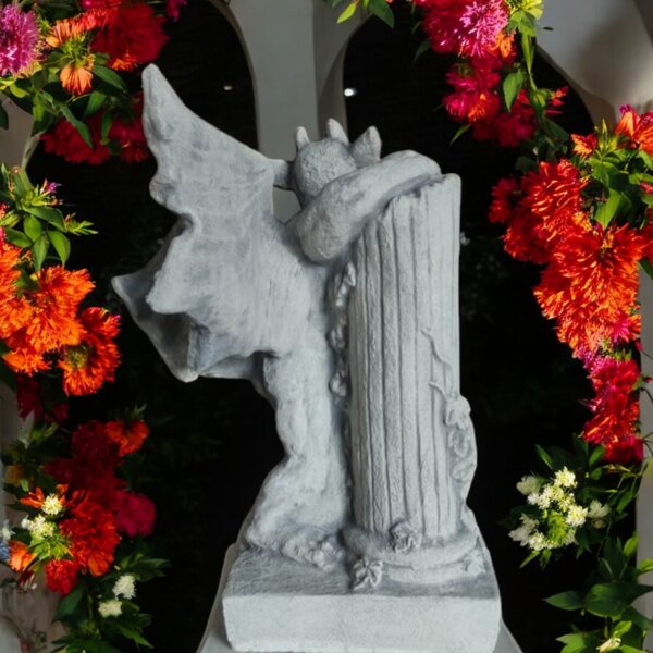 Statue en pierre reconstituée,cette très belle petite Gargouille diablotin qui se cache derrière une colonne agrémentera votre décoration extérieure. Décoration idéale pour votre jardin ou les piliers d'entrée de maison ! Fabrication artisanale, en Europe.