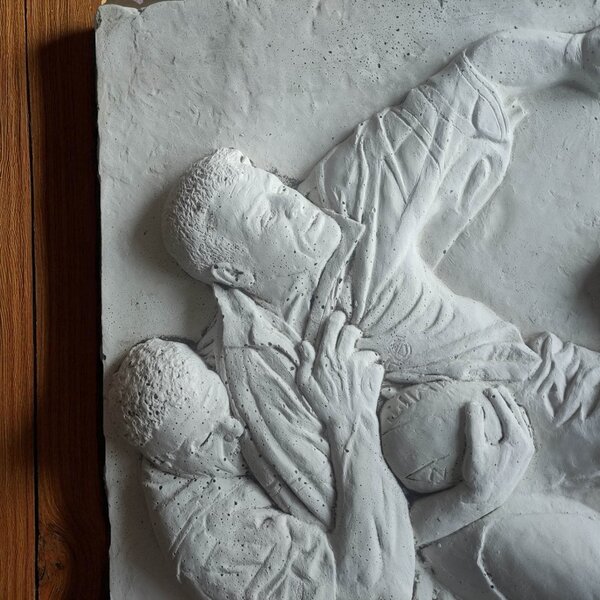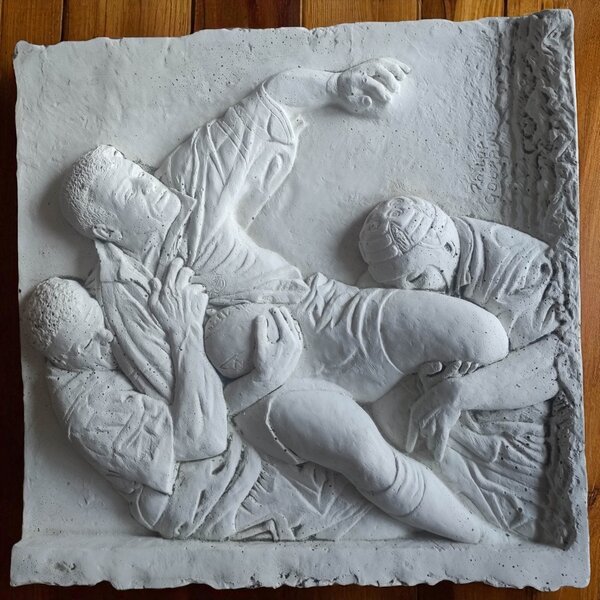 Plaque murale en pierre reconstituée, Représentant un plaquage au rugby. Décoration idéale en intérieur comme en extérieur ! Fabrication artisanale de qualité, en Europe.