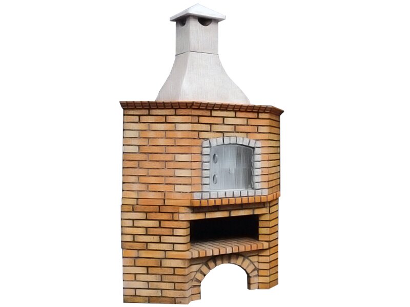 Four à pain et pizza, à bois, d'angle. Fabrication en briques rouges avec cloche en terre cuite refractaire et sole en carreaux de terre cuite posés sur un lit de sable. Idéal en extérieur comme en intérieur, facile à monter et à utiliser, sans entretien, il s’intègre aisément dans un aménagement personnalisé. Vendu avec accessoires en fer.
