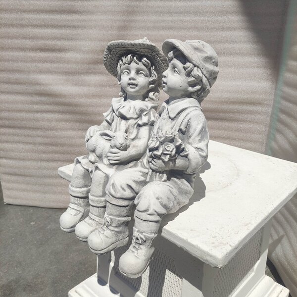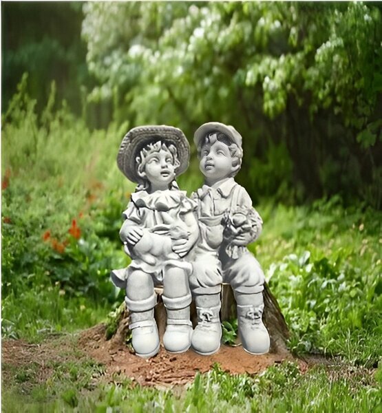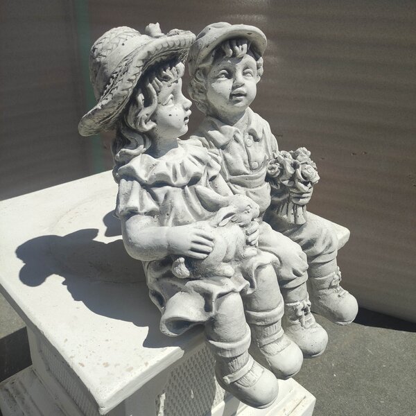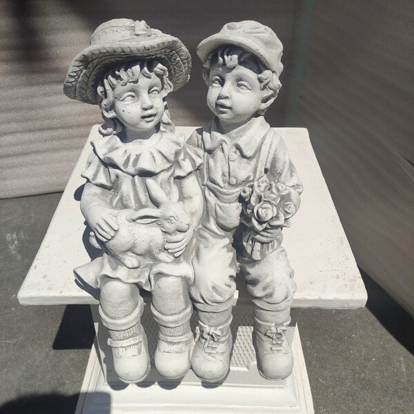 Cette adorable fillette assise avec un lapin sur les genoux à côté de ce petit garçon,tenant un bouquet de fleurs,cette charmante statuette à poser sur le support de votre choix, trouvera sans nul doute sa place au milieu de votre pelouse ou dans un petit coin de votre jardin à l'ombre d'un massif ou sur une vieille souche d'arbre.