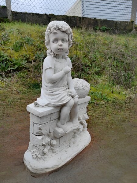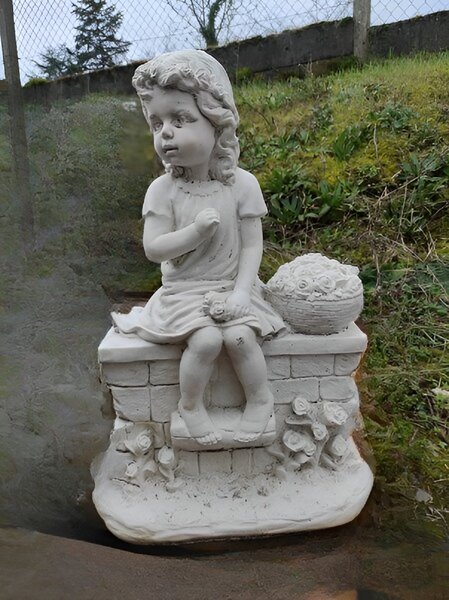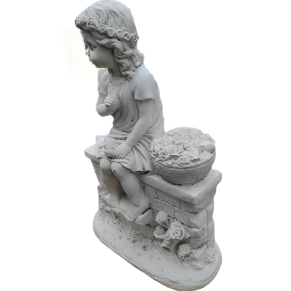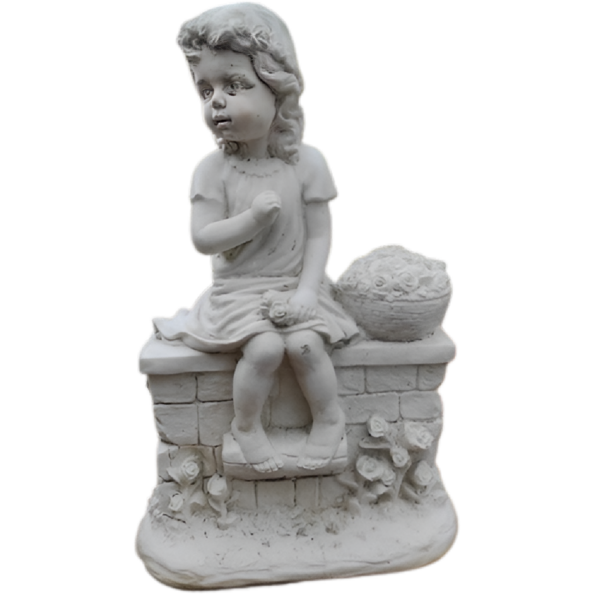 Cette adorable fillette assise sur son mur avec son petit panier de fleurs et son petit air romantique , trouvera sans nul doute sa place au milieu de votre pelouse ou dans un petit coin de votre jardin à l'ombre d'un massif ou d'un arbre.