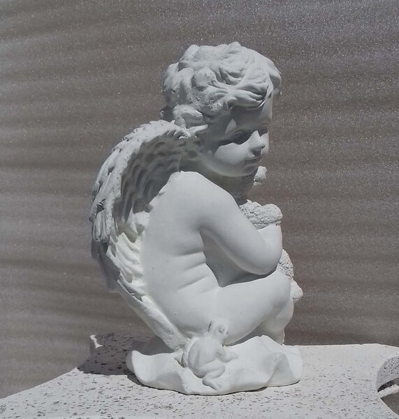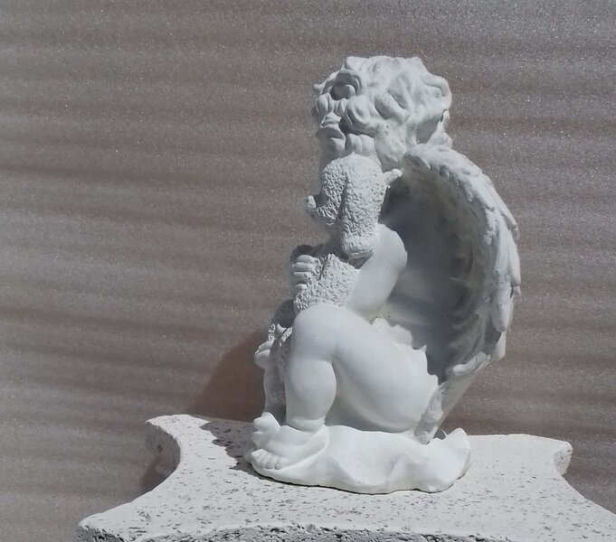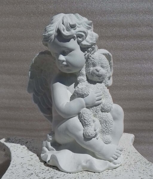 Trés jolie statue d'angelot assis tenat sa peluche.