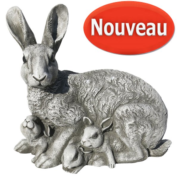 Statue en pierre reconstituée, modèle lapine et ses lapereaux cachés entre ses pattes.