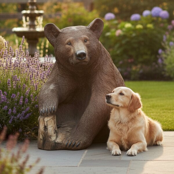 Statue en pierre reconstituée, Ours brun tellement ressemblant que l'on pourrait s'y méprendre de loin.