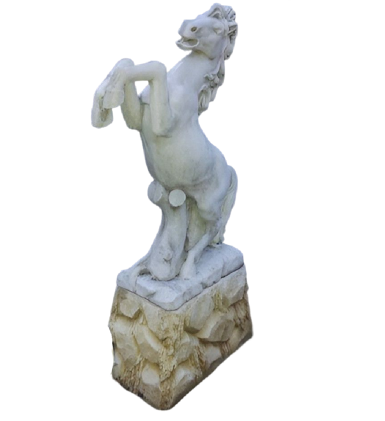 Statue en pierre reconstituée, Cheval Cabré modèle moyen sur socle. Décoration idéale pour votre jardin ou maison ! Fabrication artisanale, en Europe.