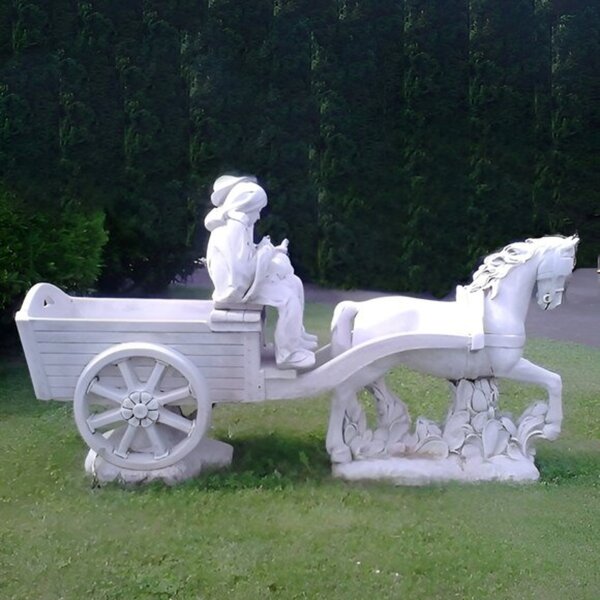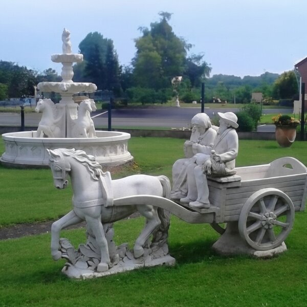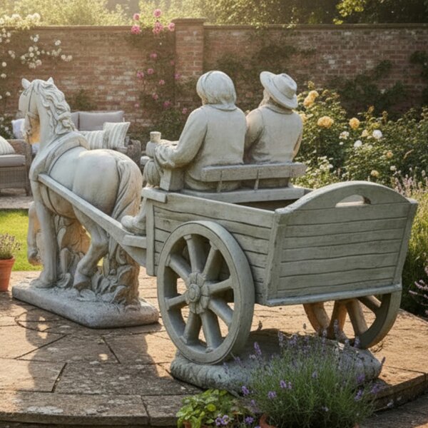 Statue en pierre reconstituée, couple de petits vieux dans  leur charette à cheval. Décoration idéale pour votre jardin ou maison ! Fabrication artisanale, en Europe.