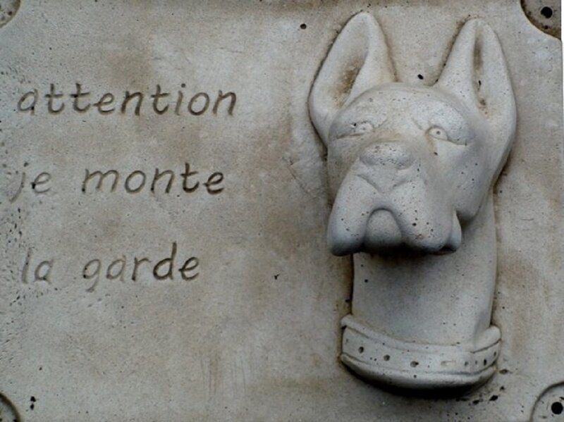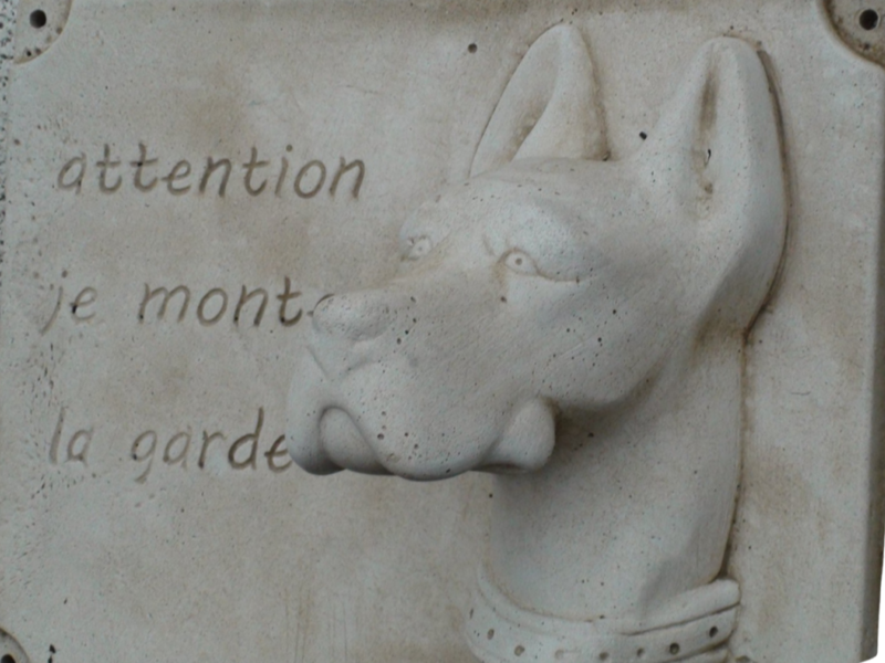 Plaque en pierre reconstituée, Dogue "Je monte la garde". Cette plaque originale avertira vos visiteurs de la présence de votre compagnon canin assurant bravement la sécurité de votre jardin. Fabrication artisanale, en Europe.