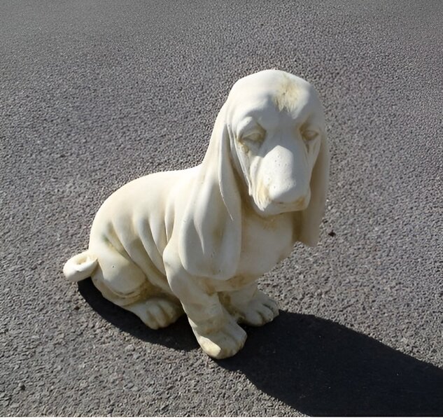 Statue en pierre reconstituée, modèle Chien Basset. Cette décoration sera du plus bel effet dans votre jardin ! Existe en trois teintes différentes : ton vieilli, ton crème, ton blanc pur. Fabrication artisanale, en Europe.
