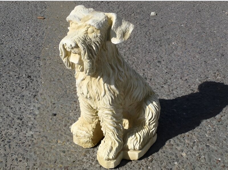 Statue en pierre reconstituée, modèle Chien Terrier. Cette décoration sera du plus bel effet dans votre jardin ! Existe en trois teinte différente : ton vieilli, ton crème, ton blanc pur. Fabrication artisanale, en Europe.