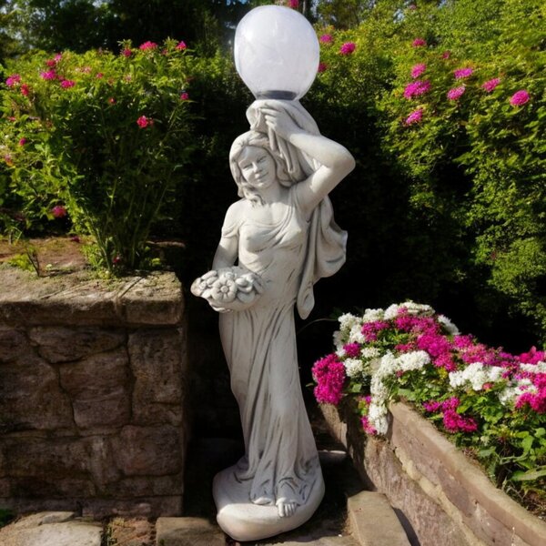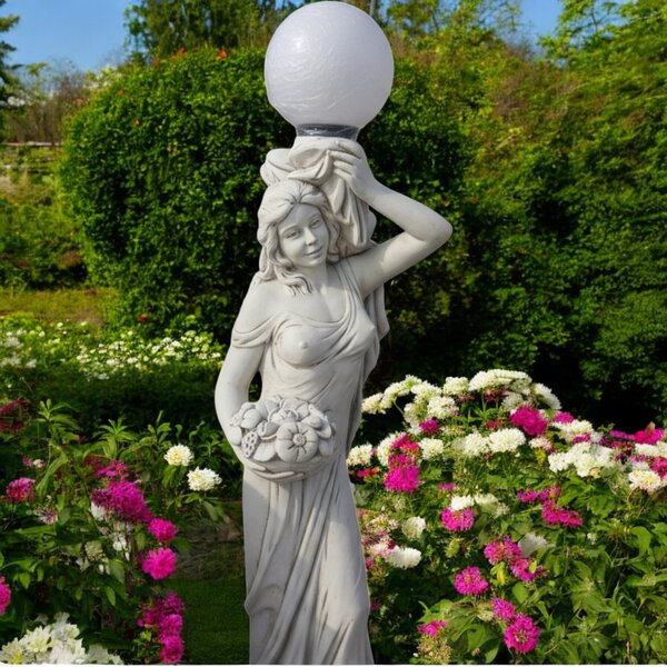 Statue Lampadaire en pierre reconstituée, modèle Femme portant un Globe. Décoration idéale pour l'intérieur et l'extérieur, Elle sera du plus bel effet dans votre jardin ! Fabrication artisanale, en Europe.