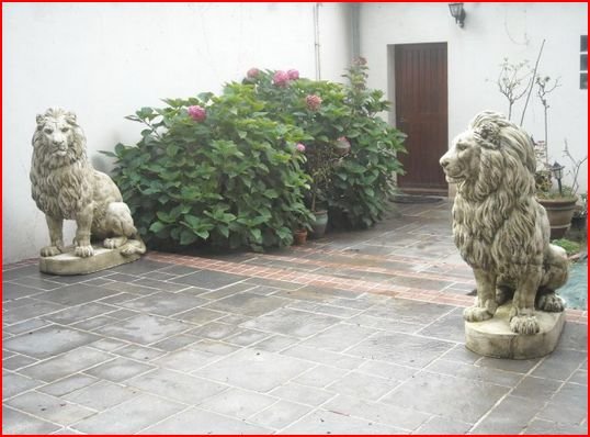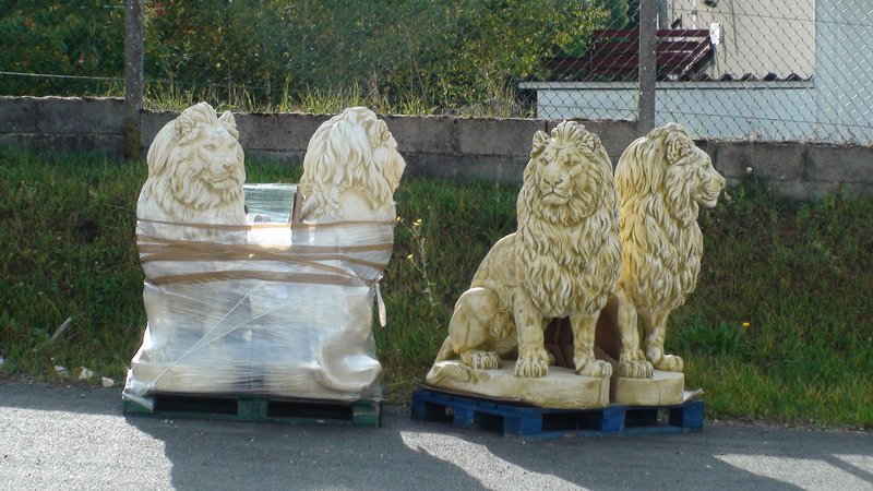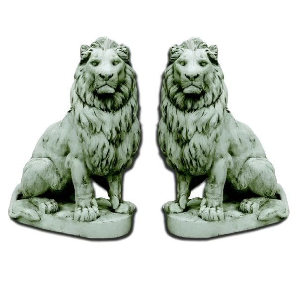 Couple de statues en pierre reconstituée, modèles Lion Géant (regard à gauche + regard à droite). Existe en trois teintes différentes : ton vieilli, ton crème, ton blanc pur (nous contacter pour votre choix). Décoration idéale en intérieur comme en extérieur, elles seront du plus bel effet dans votre jardin ou maison ! Fabrication artisanale, en Europe.