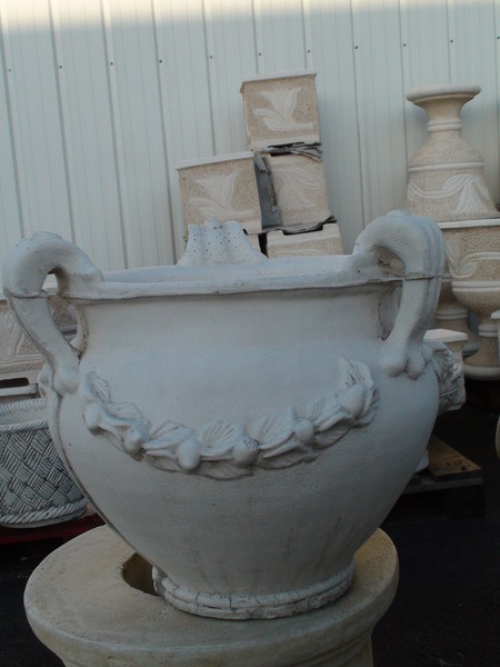 Vase en pierre reconstituée, avec anses. Idéal pour décorer votre jardin avec une composition de fleurs ! Fabrication artisanale, en Europe.