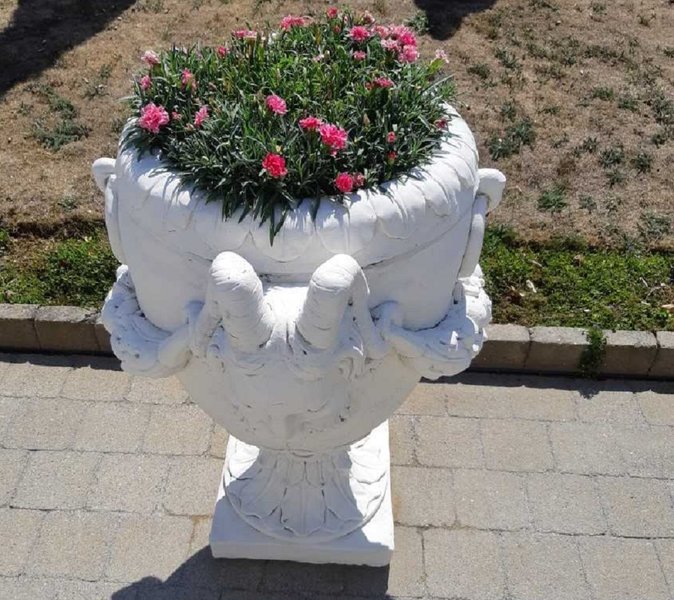 Vase en pierre reconstituée, motifs cordon de fruits et tête de Satyre, avec anneaux . Idéal pour décorer votre jardin avec une composition de fleurs ! Fabrication artisanale, en Europe.